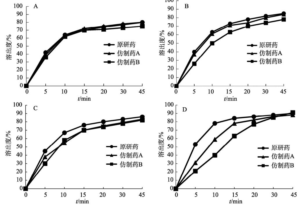本研究采用往复筒法,在4种溶出介质中均得到比桨法更有区分力的溶出曲线,结合相似因子说明仿制药A与B之间、仿制药与原研药之间的溶出行为均存在显著性差异。采用该方法可以进一步评价产品内在品质,从而为改进仿制药生产工艺提供数据参考。