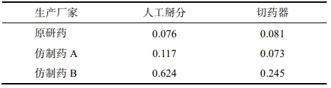 用手掰和切药器法各自分割15整片并精密称定,和分割前质量比较,计算分割后整片的质量损失。结果显示,原研药的分割质量损失低于仿制药,仿制药A在切药器法中质量损失最大,仿制药B通过人工掰分质量损失最多,见表 8。