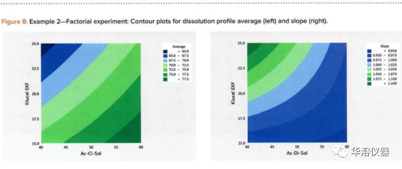 观察这些影响的最佳方法是检查图8所示平均值和斜率的响应面等高线图。我们在图6中看到的溶出平均值和斜率之间的负关系在图8中很明显,其中高平均值处于低X1-高X2,高斜率值处于高X1-低X2值。